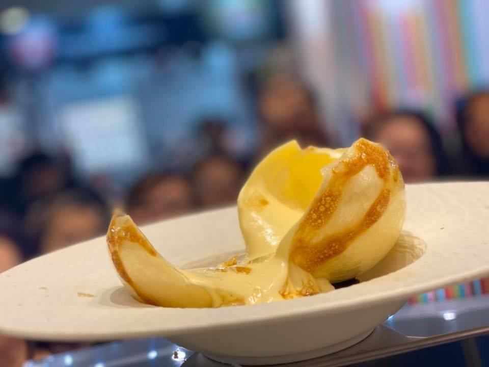 Tutti lo amano, tutti lo reclamano, il tiramisù è il dolce italiano per eccellenza, c’è chi dice che sia di origini romane, altri laziali, non c’è tavola italiana in patria e all’estero che non lo ospiti. È quindi un simbolo della tradizione, che lo chef Natale Giunta ha modernizzato in chiave gourmet, creando una sfera di zucchero soffiato che accoglie al suo interno una morbida crema al mascarpone, con sopra caviale di caffè sferificato, una tecnica che fa parte dei segreti dello chef.