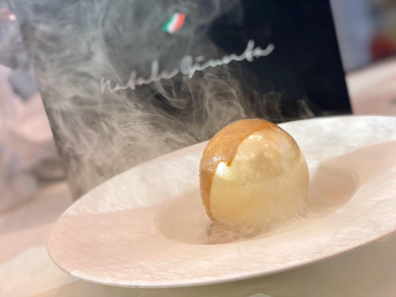 Tutti lo amano, tutti lo reclamano, il tiramisù è il dolce italiano per eccellenza, c’è chi dice che sia di origini romane, altri laziali, non c’è tavola italiana in patria e all’estero che non lo ospiti. È quindi un simbolo della tradizione, che lo chef Natale Giunta ha modernizzato in chiave gourmet, creando una sfera di zucchero soffiato che accoglie al suo interno una morbida crema al mascarpone, con sopra caviale di caffè sferificato, una tecnica che fa parte dei segreti dello chef.