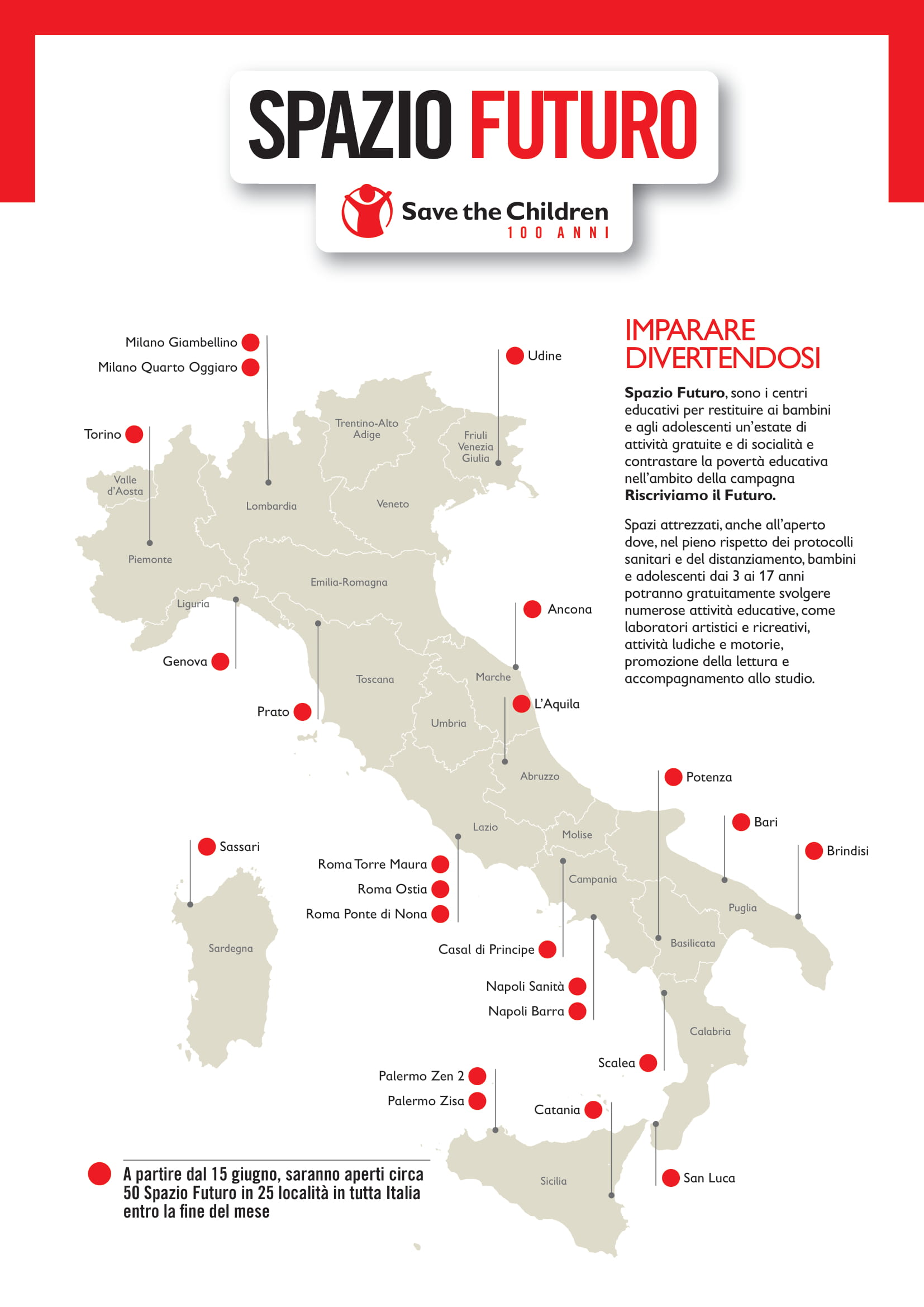 Si tratta di spazi attrezzati, anche all’aperto dove, nel pieno rispetto dei protocolli sanitari e del distanziamento, bambini e adolescenti dai 3 ai 17 anni potranno gratuitamente svolgere numerose attività educative, come laboratori artistici e ricreativi, attività ludiche e motorie, promozione della lettura e accompagnamento allo studio, con l’obiettivo di restituire loro l’estate come tempo di gioco, di educazione e di socialità. i primi Spazi Futuro che aprono oggi i battenti sono quelli di Roma, Palermo, Brindisi, Catania, Casal di Principe, Potenza e Ancona, ai quali nei prossimi giorni se ne aggiungeranno altri, sino ad arrivare entro la fine del mese a circa 50 Spazi Futuro in 25 aree territoriali in tutta Italia. Un programma di intervento esteso su tutto il territorio nazionale che è stato realizzato grazie al supporto della Fondazione Bolton Hope.