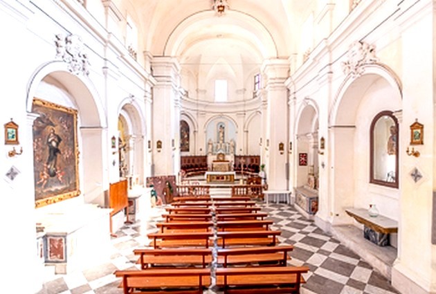 Internamente la chiesa, di gusto neoclassico, è ad un’unica navata con tre altari per lato, piccola cantoria all’ingresso ed abside semicircolare con antistante balaustra marmorea.