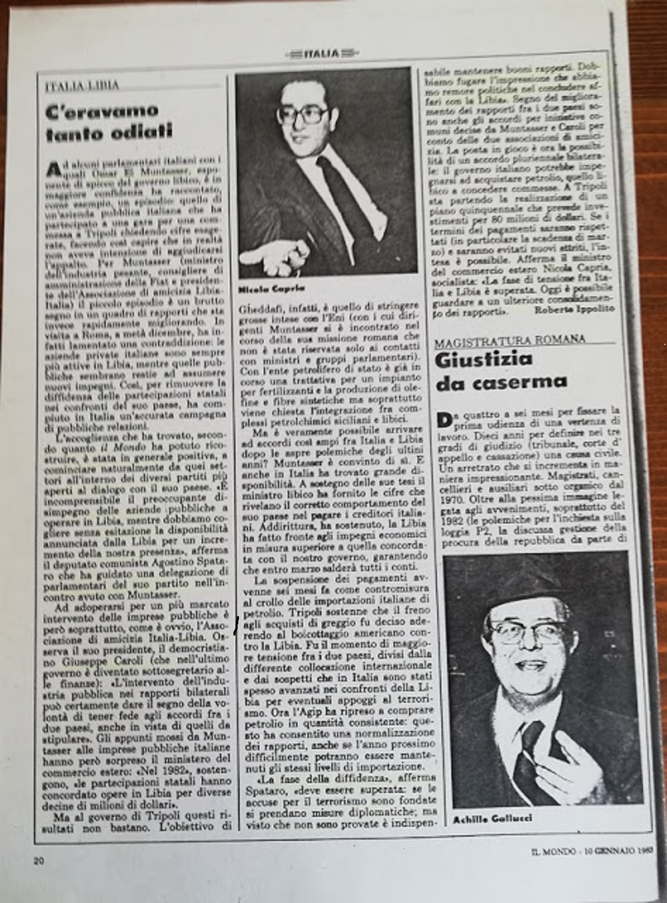 Per dare un’idea dei nostri rapporti con la Libia negli anni ’80 pubblico alcuni documenti dal mio archivio, dai quali si evince che in quel periodo si realizzò una buona concordanza politico/diplomatica fra i governi (soprattutto per impulso del ministro degli esteri Giulio Andreotti) e il Pci all’opposizione. Spesso parlamentari del Pci, della Dc, del Psi lavorammo insieme e con esiti assai soddisfacenti per gli interessi di entrambi i Paesi e a beneficio della pace nella regione. Chiudo con l’augurio che i 18 pescatori siciliani possano, al più presto, riabbracciare le loro famiglie, a Mazara. (a.s.)