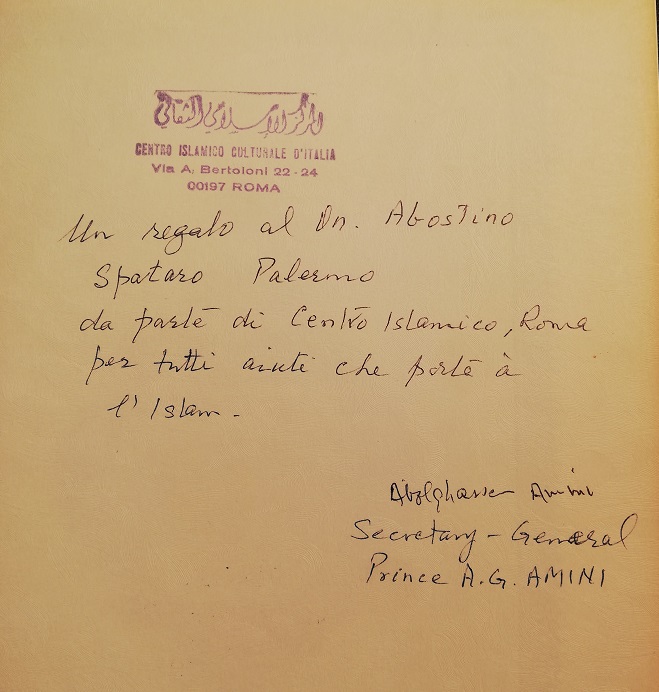 Il principe mi strinse entrambe le mani e mi volle insignire di una medaglia e regalare un bellissimo esemplare del Corano, che conservo gelosamente, con una sua dedica riconoscente: “All’on. Agostino Spataro… per tutto l’aiuto che ha dato all’Islam”.