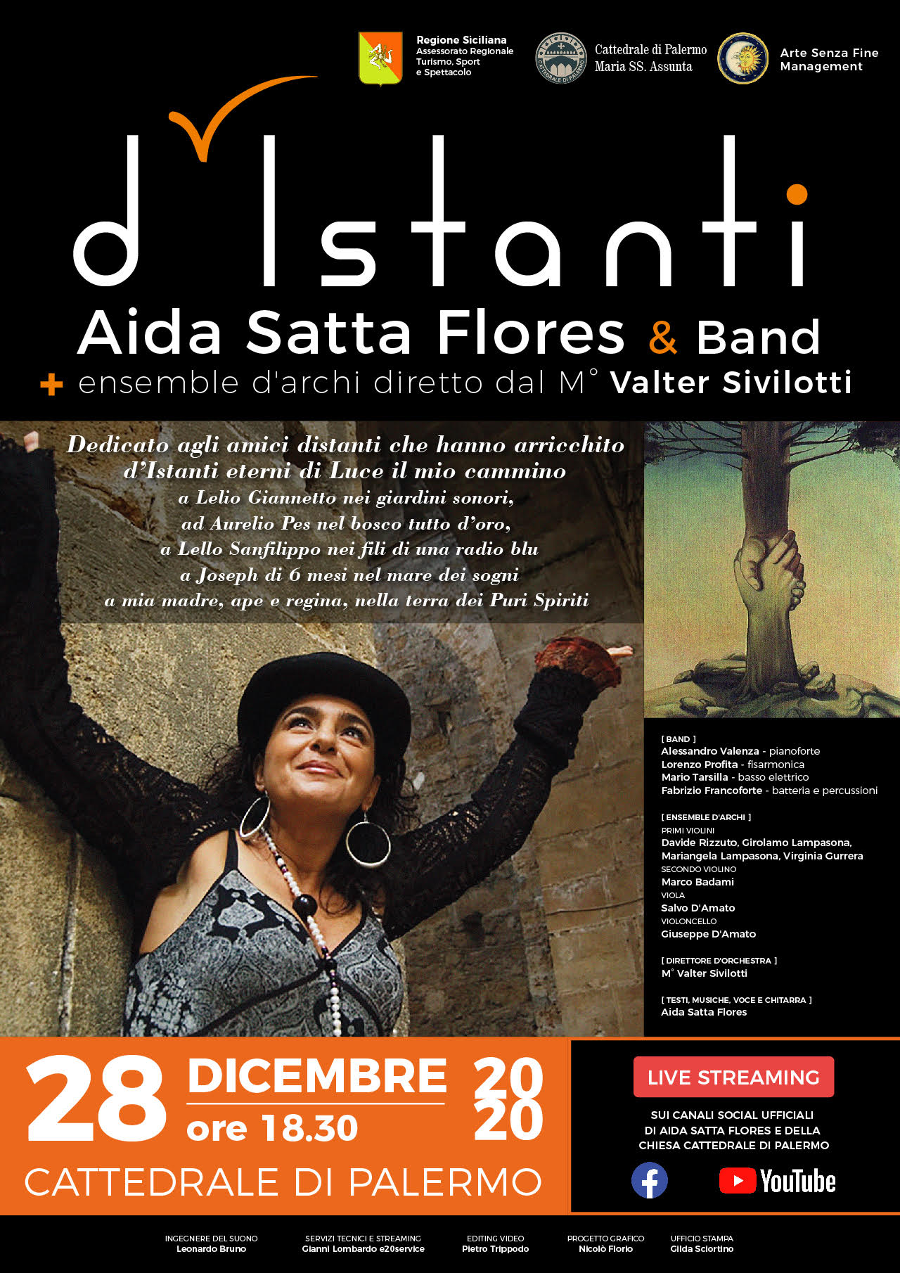 Il concerto in streaming di Aida Satta Flores, band ed ensemble d’archi – Direzione Musicale M° Valter Sivilotti, è dedicato ad Aurelio Pes, Lelio Giannetto, Lello Sanfilippo e al piccolo Joseph, morto a soli 6 mesi nel Mare Mediterraneo l’11 novembre 2020. Oltre alla diretta streaming verrà realizzato il videoclip, a cura di Pietro Trippodo, del primo singolo inedito della Satta Flores, “Senza voce”, che anticipa la pubblicazione nel 2021 del CD+VINILE e DVD live “d’Istanti”.