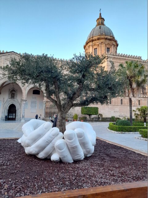 «Non immaginavo che la Cattedrale si potesse trasformare in una piazza – afferma Aida Satta Flores -. Il lockdown mi ha fatto capire, aldilà del Covid, dell’indifferenza che va combattuta dedicandoci al Pianeta Terra. Ci sono delle emozioni che non si possono raccontare e lo ha detto il mio cuore incendiato sin da quando sono arrivata in Cattedrale e mi hanno accolto due mani congiunte: “Give”, la splendida scultura di Lorenzo Quinn. Gesù bambino quest’anno è nato prima, Babbo Natale è arrivato dopo. Qualcosa non va. Sono gli equilibri di questa matta umanità. Pure il Bambinello ha capito che lo spazio e il tempo sono relativi. Qui siamo di passaggio. C’è chi vive sei mesi come Joseph, chi 100, chi 88 come mia madre. La vita è breve, facciamone un capolavoro. Ho cantato in una Cattedrale arabo normanna, sito patrimonio UNESCO. Queste cose rimangono nel tempo perché sono il segnale che le differenze danno frutti. Mischiare le razze significa crescere perché prendiamo del buono da tutti. “d’Istanti” è stato il piccolo tentativo di una cantautrice siciliana e di alcuni musicisti di comunicarvi che, se non ci mettiamo il cuore e capiamo che siamo tutti fratelli, avremo sbagliato».
