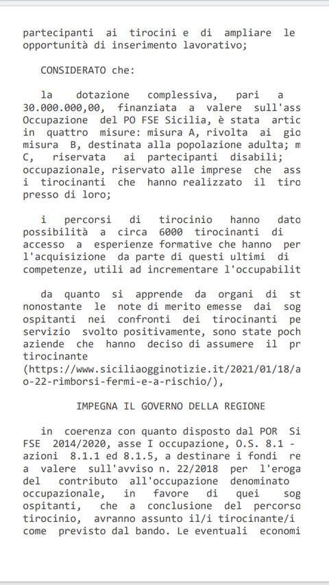 i tirocinanti dell’avviso 22 hanno avanzato una richiesta alla regione Siciliana tramite un ordine del giorno presentato dai deputati del movimento cinque stelle all’Ars Nuccio di Paola membro della commissione bilancio e Roberta Schillaci membro della commissione lavoro.