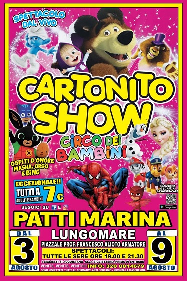 Un successo firmato Happy Circus dei fratelli Medini, una produzione interamente dedicata al mondo dei cartoon in tour in Sicilia, è “Cartonito Show”. dal 3 al 9 agosto a Patti Marina, nel messinese.