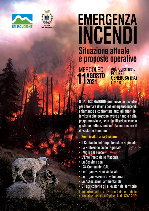 E’ un incontro promosso dal GAL Madonie e il Comune di Polizzi Generosa, quello di mercoledì 11 Agosto alle ore 18.00, dove si discuterà sulle problematiche e le iniziative da intraprendere, sulle attuali condizioni territoriali messa a tappeto dagli incendi che si sono succeduti in questi giorni nel territorio delle Madonie.