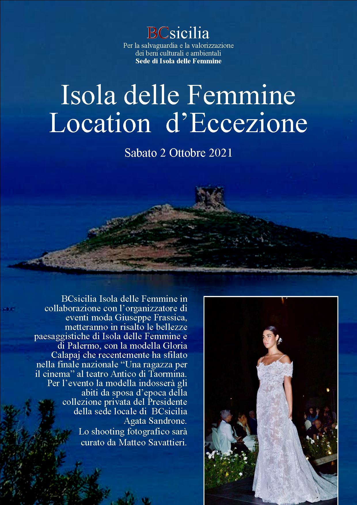 Sabato 2 Ottobre 2021 Isola delle Femmine sarà una location d’eccezione. BCsicilia Isola delle Femmine in collaborazione con l’organizzatore di eventi moda Giuseppe Frassica, metteranno in risalto le bellezze paesaggistiche di Isola delle Femmine e di Palermo, con la modella Gloria Calapaj che recentemente ha sfilato nella finale nazionale “Una ragazza per il cinema” al teatro Antico di Taormina. Per l’evento la modella indosserà gli abiti da sposa d’epoca della collezione privata del Presidente della sede locale di BCsicilia Agata Sandrone. Invece il modello Livio Caponata indosserà gli abiti di Immagine Sposo di Messina. Lo shooting fotografico sarà curato da Matteo Savattieri.