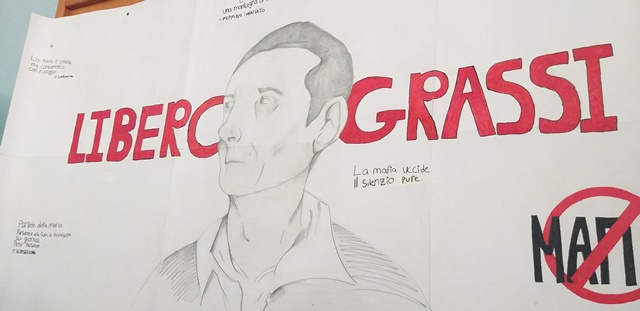 Dopo i saluti istituzionali da parte della dirigente, la prof.ssa Gisella Parise, l’arch. Grassi ha rievocato con profonda commozione, da subito tangibile anche nell’uditorio, la determinazione del padre, precipitato all’improvviso in una specie di discesa agli Inferi per essersi rifiutato di condividere il frutto del suo lavoro con il malaffare: telefonate minacciose, il cane di famiglia ridotto in fin di vita, la rapina delle buste paghe dei propri operai, che prontamente riuscì ad erogare nuovamente, e infine la morte, nonostante il clamore mediatico creatosi intorno alla sua persona, fattore che, paradossalmente, lo rese più debole in quanto divenne il simbolo di un’ostinazione non ammissibile. Intanto il vuoto si era creato intorno a lui perché politici corrotti e trascuratezza lo avevano trasformato in una vittima predestinata. Terminata l’appassionata rievocazione del clima culturale e sociale di quel periodo, i primi studenti si sono avvicendati ai microfoni per proporre i propri contributi: alcuni hanno realizzato un omaggio a Libero Grassi con una gigantografia; altri hanno scritto poesie o esposto le proprie riflessioni.