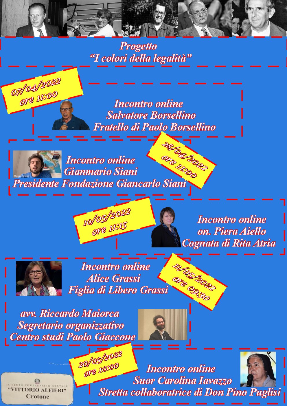Ricordiamo che il progetto denominato “I colori della legalità”, si sviluppa in due fasi, nella prima fase, si lavorerà con gli studenti per presentare i contenuti della cittadinanza attiva e della legalità mediante anche la conoscenza dei protagonisti della società civile italiana e la riflessione sul loro sacrificio. Nell’ultima fase, prevista per il giorno 23 maggio, Giornata nazionale della legalità, verranno apposte delle targhette con il nome del protagonista della legalità prescelto su ogni aula scolastica, in modo da ricordarne permanentemente la figura e l’operato; ciascun ambiente scolastico degli studenti verrà impreziosito poi con i contributi grafici, testuali, poetici realizzati dagli allievi stessi.