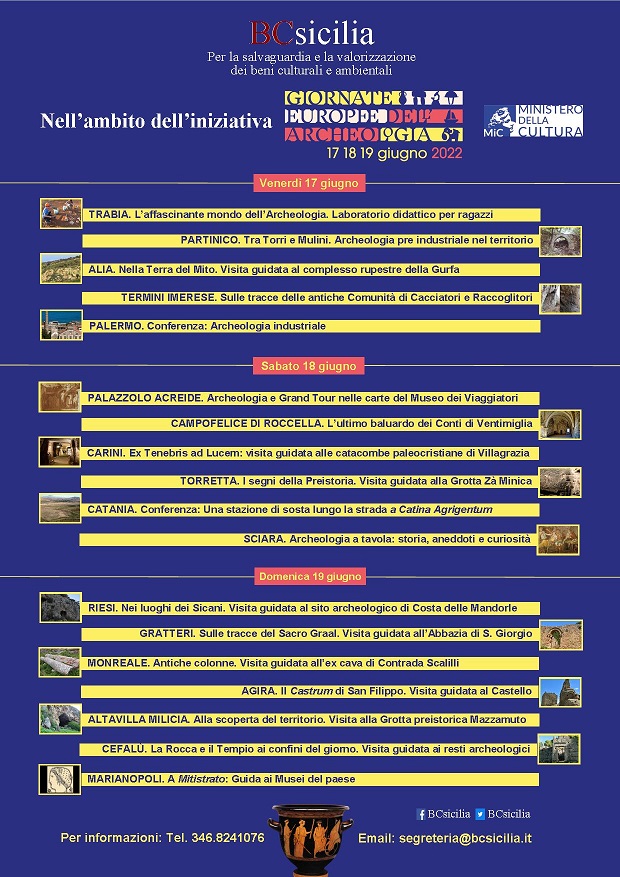 Visite guidate, conferenze, presentazioni di libri, laboratori per ragazzi sono alcuni dei 18 appuntamenti promossi da BCsicilia per le “Giornate Europee dell’Archeologia” che si tengono, come ogni anno, dal 17 al 19 giugno, in tutto il vecchio continente e che in Italia hanno il patrocinio del Ministero della Cultura. Iniziative di BCsicilia in giro per tutta l’isola: da Palermo a Palazzolo Acreide, da Catania a Cefalù, da Agira a Riesi. Andremo alla scoperta di grotte preistoriche, parleremo di archeologia industriale e stazioni di posta del periodo romano, conosceremo antichi castelli e visiteremo catacombe paleocristiane, passeggeremo tra torri e mulini, saremo nei luoghi dei Sicani ed andremo alla scoperta delle mitiche tracce del Sacro Graal, e apprenderemo curiosità e aneddoti dell’Archeologia a tavola. Una bellissima occasione per conoscere e valorizzare il patrimonio archeologico della Sicilia. Si inizia il venerdì 17 giugno con un laboratorio didattico per ragazzi e si conclude con la presentazione del libro su musei di Marianopoli. Le iniziative sono realizzate con il patrocinio di diversi Comuni e in collaborazione con diverse associazioni tra cui: Anisa, Archeoclub, Museo dei viaggiatori, Archeofficina.