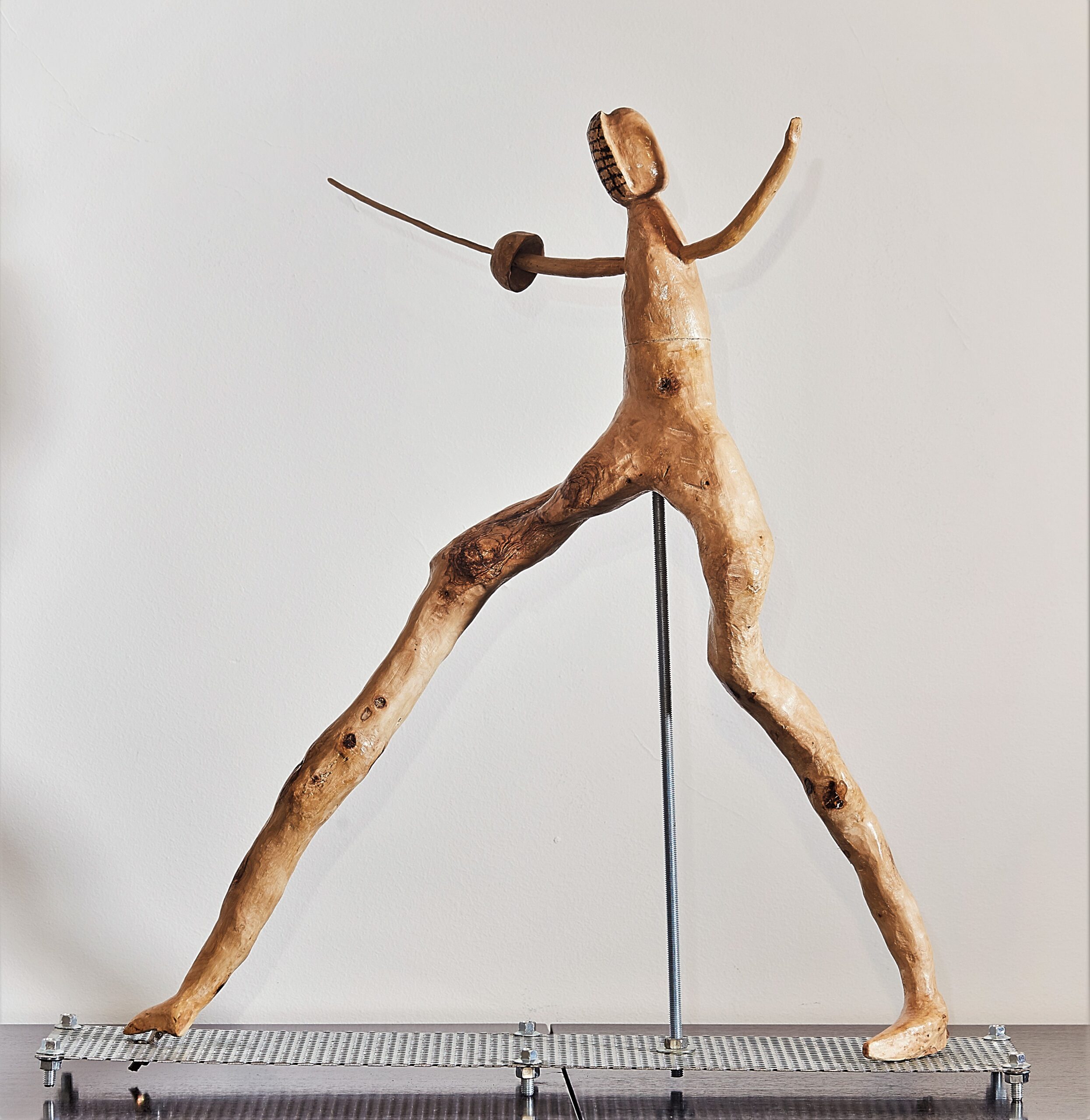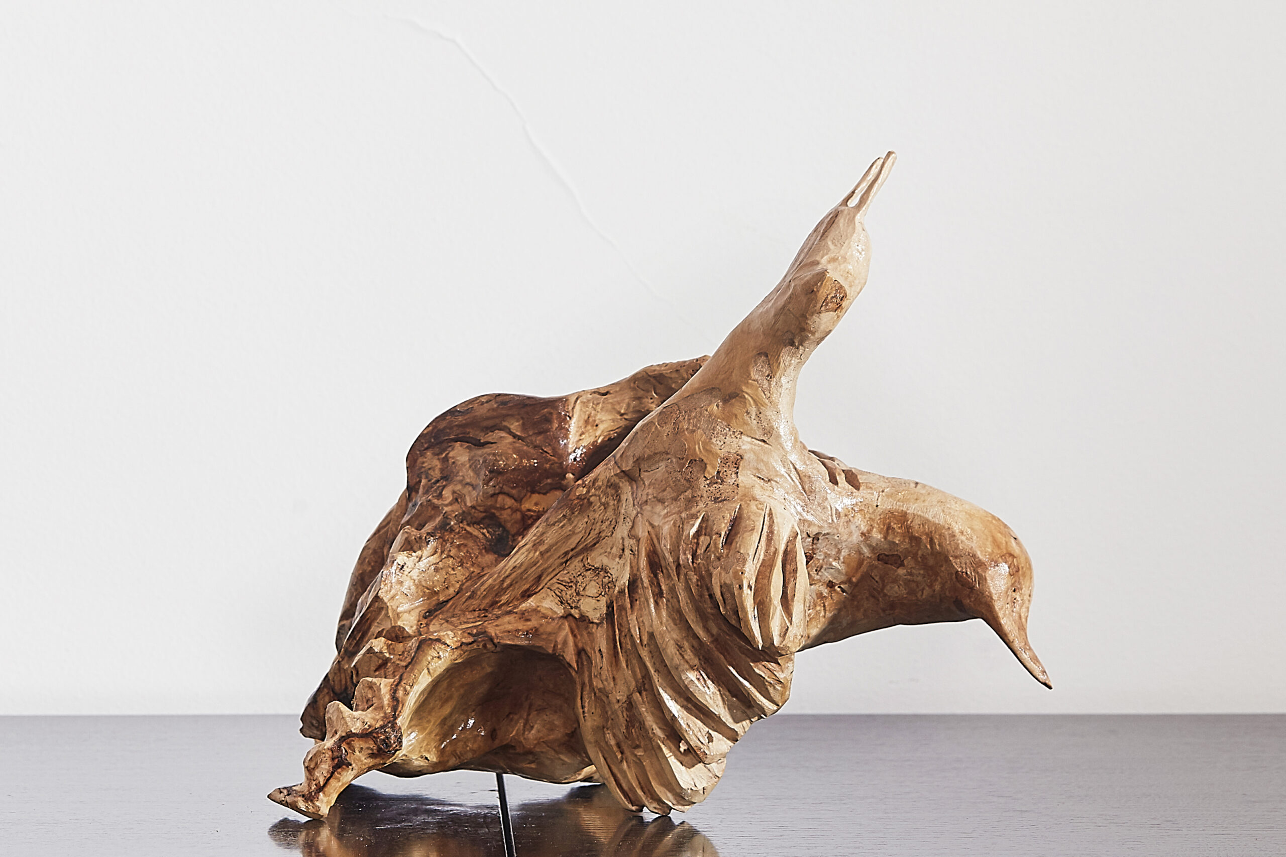 Le sculture di Gika sono il punto d’equilibrio tra l’immaginario personale e i limiti e le particolarità della materia che sceglie di scolpire: una radice centenaria di ulivo o la liscia compattezza di una tavola industriale perfettamente piallata di frassino rappresentano il limite fisico entro cui l’Artista vincola ogni possibile sviluppo della propria creazione. È il lavoro continuo di pulitura fatto con scalpello e fresa, il seguire le venature e i difetti della pianta, il ripercorrerne la vita incontrando le fragilità e la marcescenza, il taglio impietoso, la potatura, il difetto dovuto al sole torrido o al gelo improvviso che morde l’inverno siciliano così denso di luce e fiori da sembrar già piena primavera.