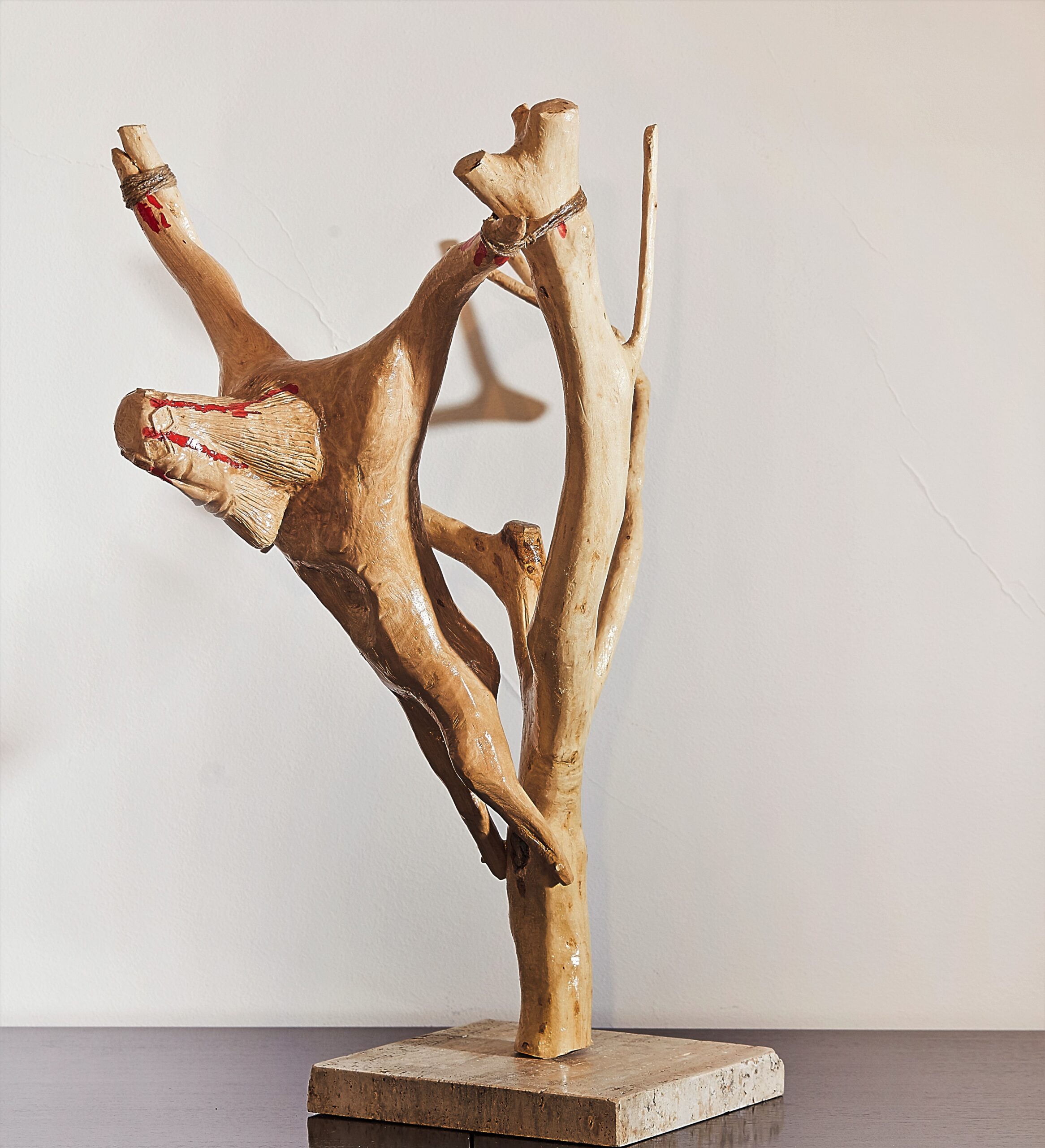 L’arte di Gika, invece, segue il principio opposto: è la materia a suggerire la forma finale, a dare spunto per il contenuto, il soggetto, i limiti spaziali del lavoro. Il suo scolpire è arte di relazione, un continuo danzare tra l’identità del corpo grezzo – la propria essenza, la propria natura – e la curiosità della mente creatrice. Uno scultore apodittico, che contiene nel proprio immaginario la certezza dell’opera finita, sarà sicuramente attratto dall’argilla o dalla cera, dalla progettazione in 3D, da qualsiasi materiale sia facilmente piegabile al proprio volere: la getterà poi in oro o bronzo fuso, la cuocerà in forno, l’affiderà a una stampante per dare alla scultura una solida durevolezza. Uno scultore dialettico, invece, resta affascinato da un materiale con una propria storia, pieno di segni del tempo, di cicatrici della vita. Che sia il tronco o la radice di una pianta o un pezzo di marmo fortemente venato, il suo interesse andrà verso la forma nascosta, da liberare e portare alla luce.