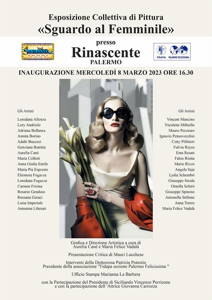 “Sguardo al femminile” è il titolo della collettiva pittorica che si terrà a Palermo negli spazi del Centro commerciale “La Rinascente” in via Roma 289, in occasione delle tradizionali celebrazioni della Festa della Donna.