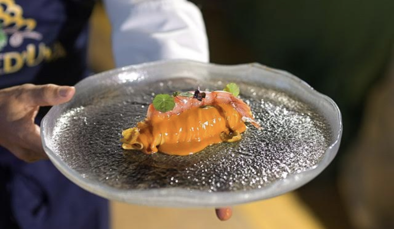 Pietanze proposte su dei meravigliosi piatti artistici realizzati dal maestro Alessandro Di Rosa (Talhass Glass), che ha realizzato anche le targhe ricordo donate ai protagonisti. Tra i piatti d’eccellenza preparati con arte, il “Risotto mantecato al mosto cotto di nero d’Avola con gelatina di uva e bottarga di tonno rosso” dello chef Patti, il risotto “Birbantello” con salsa di uva Italia dello Chef Visalli, il “tagliolino 30 tuorli con gambero rosso, bisque e mosto d’uva” di Mario Peqini e il dolce “Ambrato” con gel d’uva del Pastry chef Vincenzo Cinardo, “L’inno Alla Batua”, cin cake all’ olio di oliva e mandorle, la zucchina dolce, e granita di uva dello chef Li Calzi.