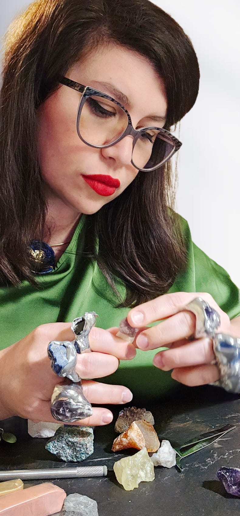 Realizzati con pietre pregiate, i suoi gioielli sono sculture da indossare: iniziali, semplici ed essenziali.
