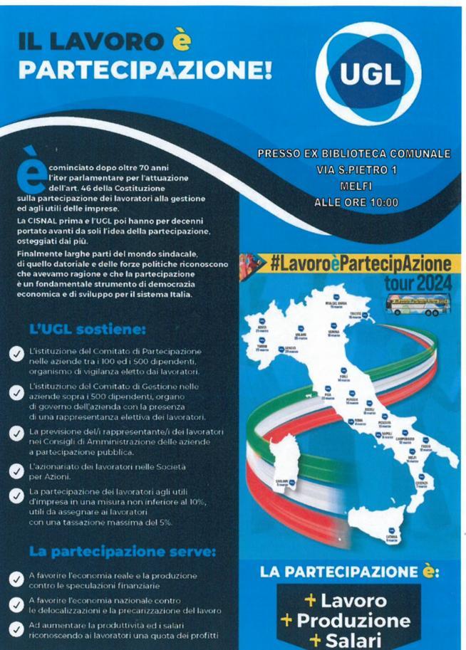 #LavoroèPartecipAzione: un tema che sta particolarmente a cuore al sindacato Ugl. In un momento storico in cui risulta evidente l’acuirsi delle disparità sociali, l’Ugl propone di sottoscrivere un nuovo Patto per il Lavoro e di rivedere l’attuale modello di relazioni industriali, al fine di garantire un contributo più consapevole e più attivo dei lavoratori alle sorti delle imprese, favorendo l’attuazione del diritto costituzionalmente previsto dall’articolo 46 ma rimasto tuttora inattuato. Per la Basilicata, la città federiciana di Melfi sarà l’unica tappa del ‘Pullman tour dell’UGL’ e si conclude il 25 marzo a Milano, data che coincide con il 74 ° anniversario dalla nascita del sindacato.