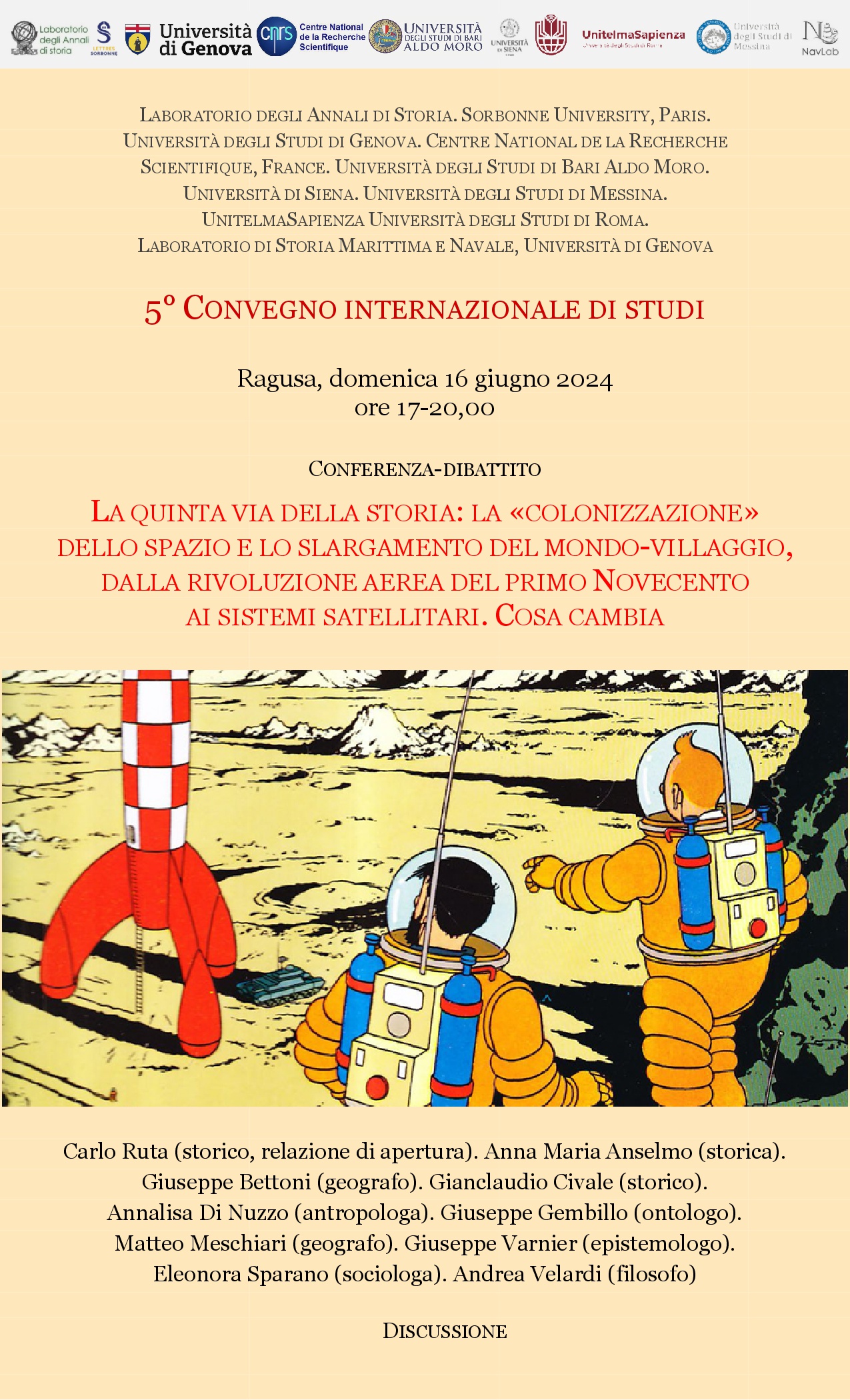 Infine, dalle 17 alle 20 del 16 giugno si terrà la sessione conclusiva, con la conferenza La quinta via della storia. La «colonizzazione» dello spazio e lo slargamento del mondo-villaggio, dalla rivoluzione aerea del primo Novecento ai sistemi satellitari: cosa cambia?, con la relazione di apertura di Carlo Ruta e gli interventi di Anna Maria Anselmo, Giuseppe Bettoni, Gianclaudio Civale, Giuseppe Gembillo, Matteo Meschiari, Sandra Origone, Eleonora Sparano, Giuseppe Varnier, Andrea Velardi. Seguirà il dibattito.