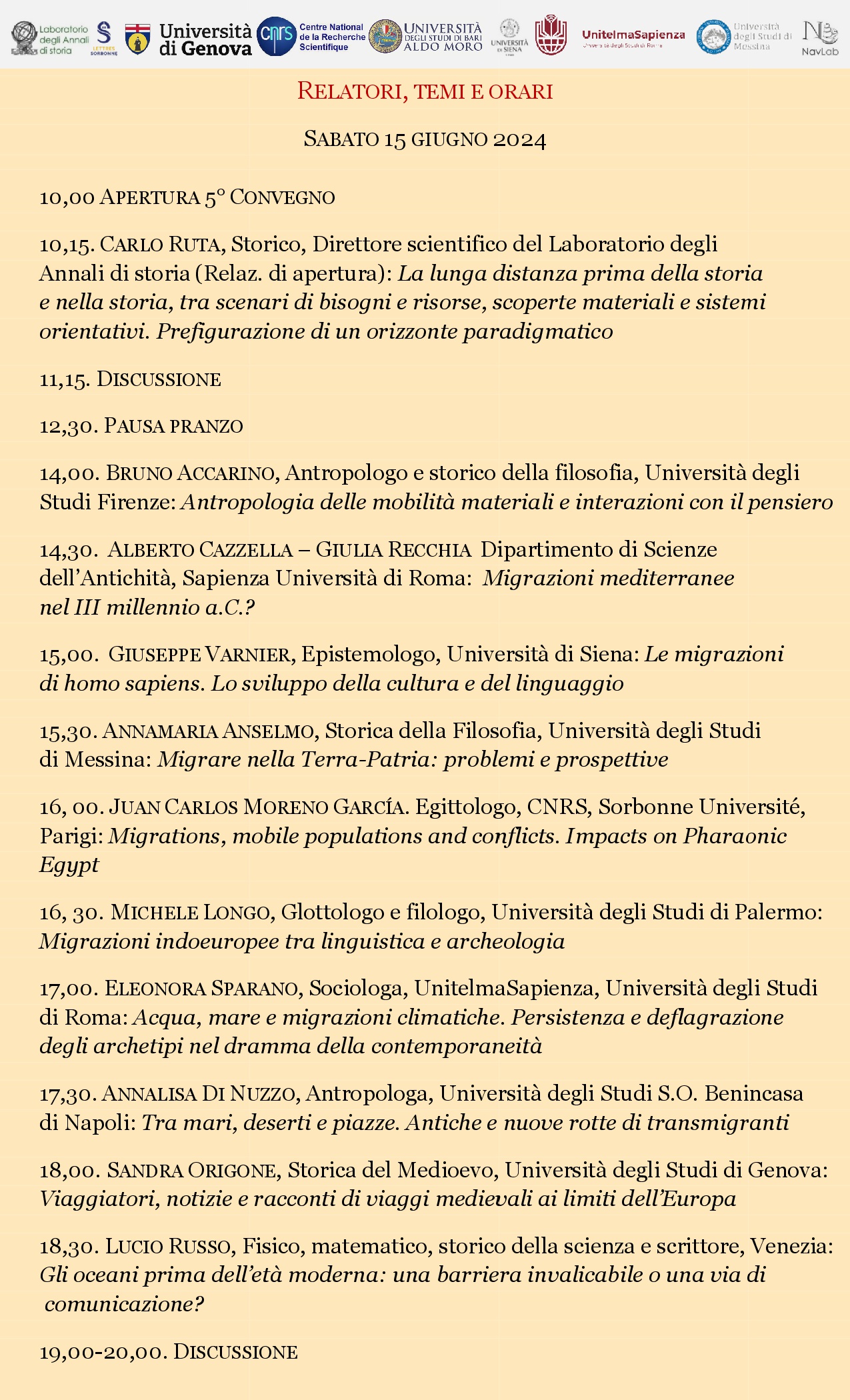 Il Convegno sarà aperto la mattina del 15 giugno da un’ampia relazione del direttore scientifico Carlo Ruta, su un tragitto paradigmatico che convergerà sul modello della lunga distanza come elemento propulsore della storia e asse dinamico delle civilizzazioni, dopo cui si aprirà un primo dibattito. Seguiranno nella sessione pomeridiana le relazioni dei seguenti studiosi: i paletnologi Alberto Gazzella e Giulia Recca (Sapienza Università di Roma), l’epistemologo Giuseppe Varnier (Università di Siena), la storica della filosofia Annamaria Anselmo (Università di Messina), l’egittologo francese Juan Carlos Moreno García (Sorbonne Université Paris), il glottologo Michele Longo (Università di Palermo), la sociologa Eleonora Sparano (UnitelmaSapienza di Roma), l’antropologa Annalisa Di Nuzzo (Università Benincasa di Napoli), la storica Sandra Origone (Università di Genova), il fisico-matematico Luigi Russo. Dalle 19 alle 20,30 seguirà la seconda discussione.