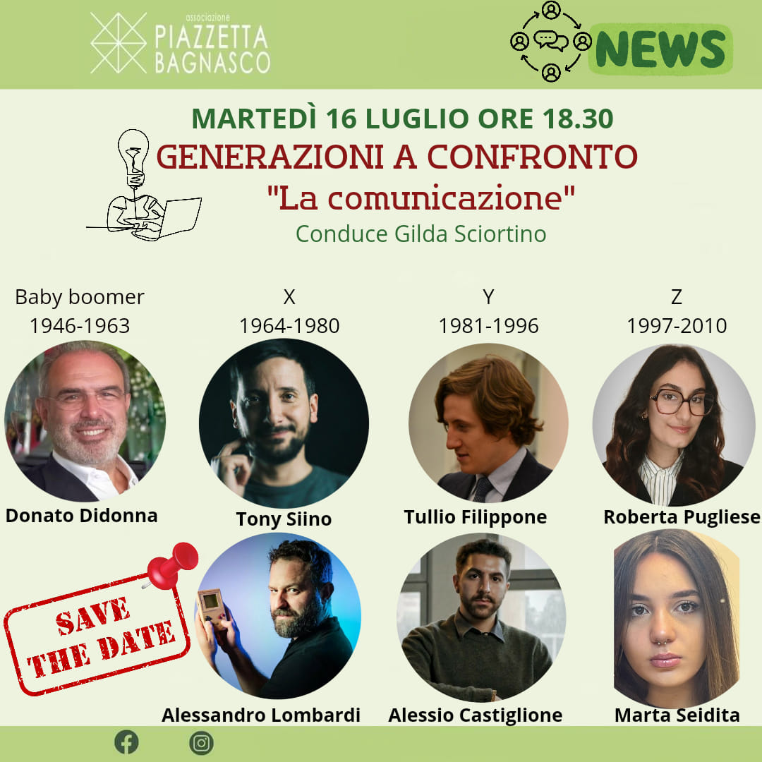 L’atteso evento, novità della stagione 2024 di piazzetta Bagnasco, è finalmente arrivato. “Generazioni a Confronto” il format che vedrà rappresentanti di Baby Boomer, Generazioni X, Y e Z, incontrarsi per raccontare e raccontarsi a partire da come si comunicava e si comunica oggi