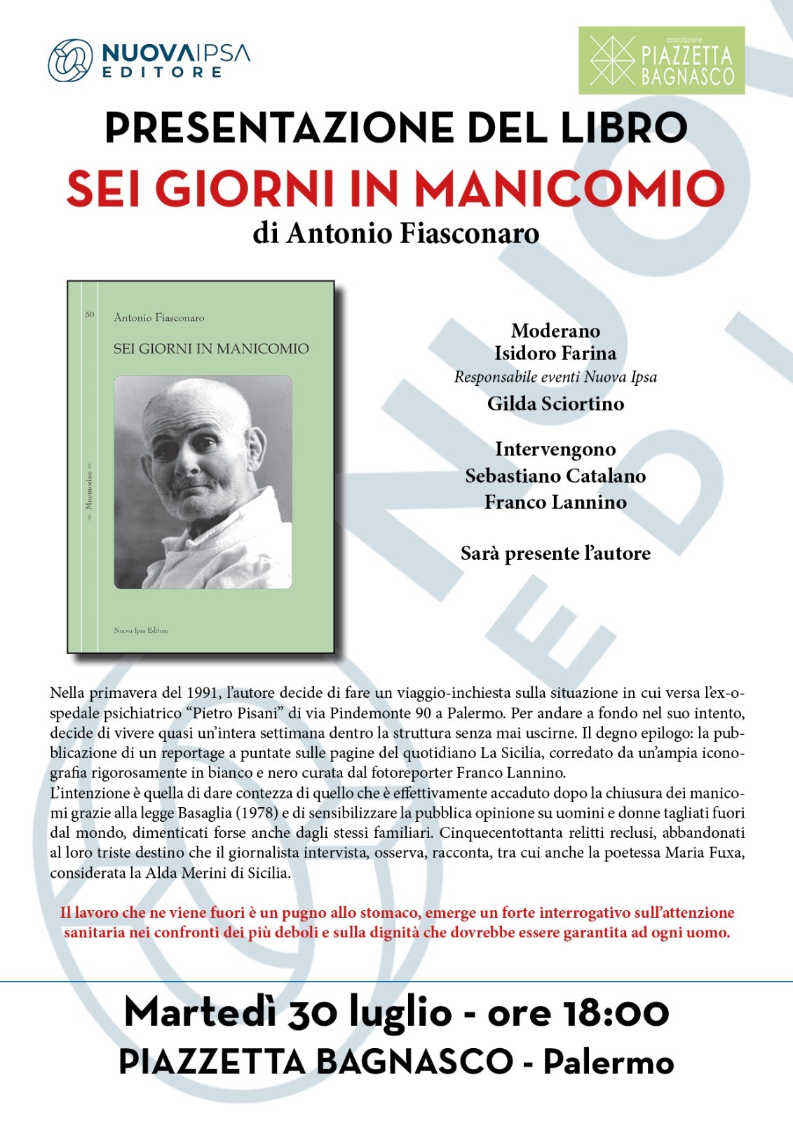 S’intitola “Sei giorni in manicomio”, il libro scritto da Antonio Fiasconaro ed edito da Nuova Ipsa, con la postfazione di Salvatore Amato, che verrà presentato alle 18 di martedì 30 Luglio in piazzetta Bagnasco.