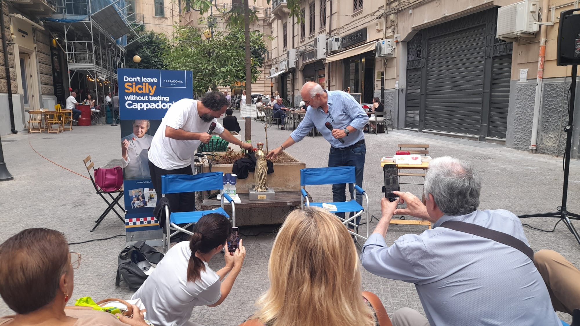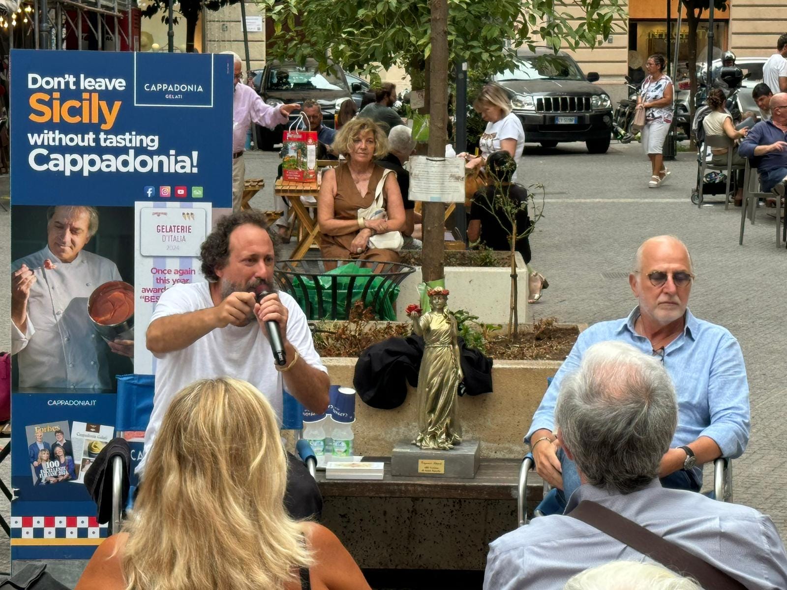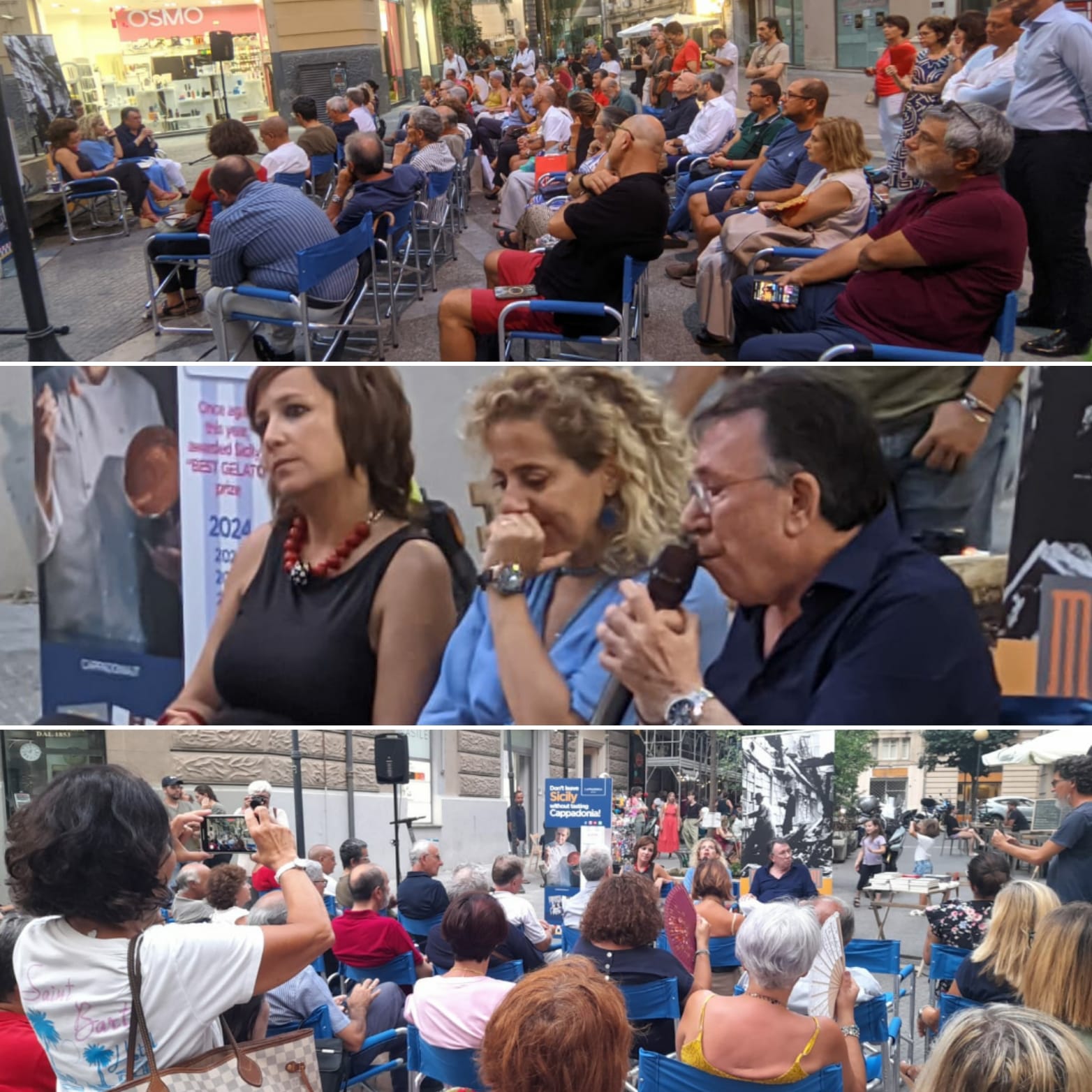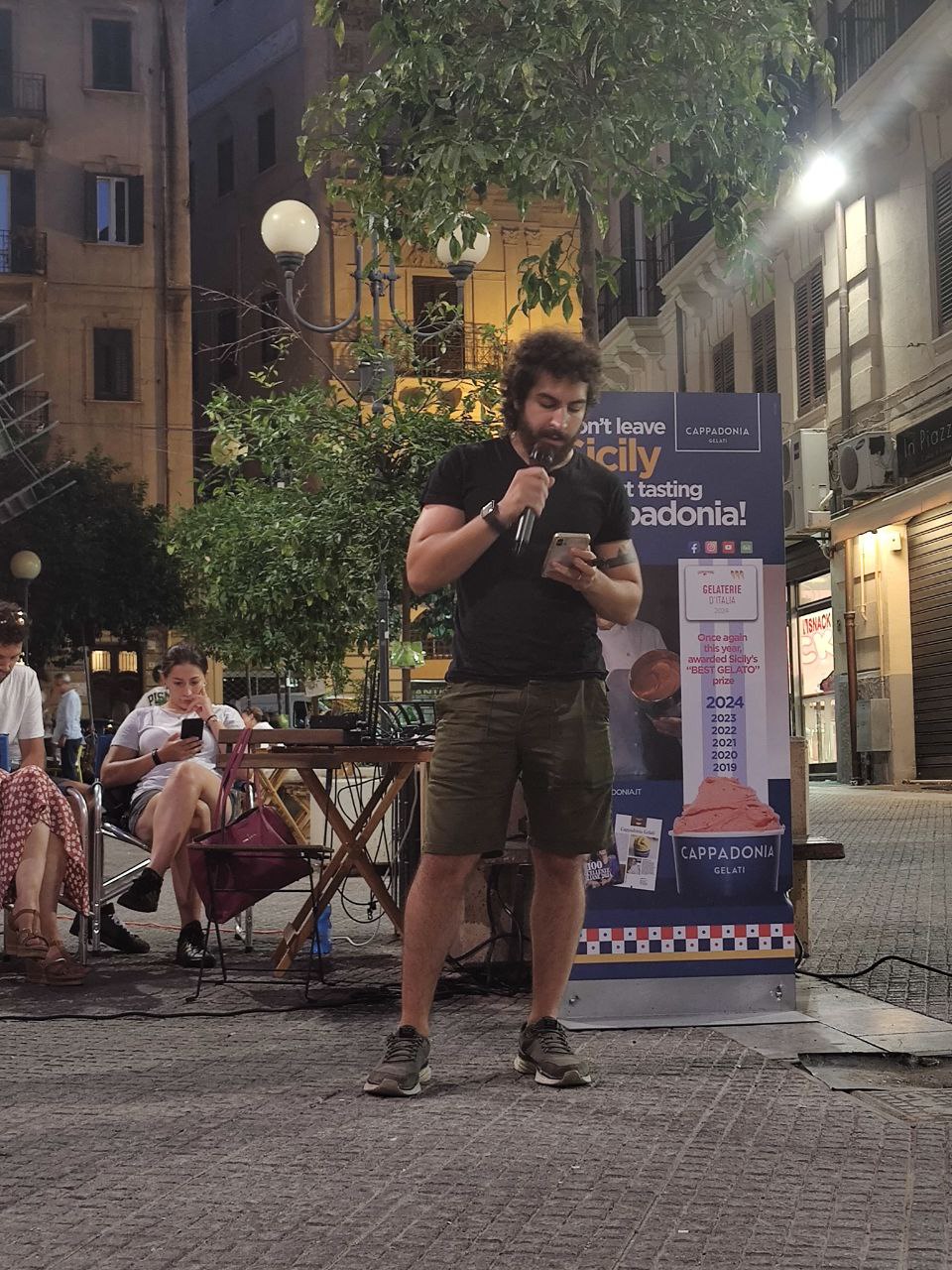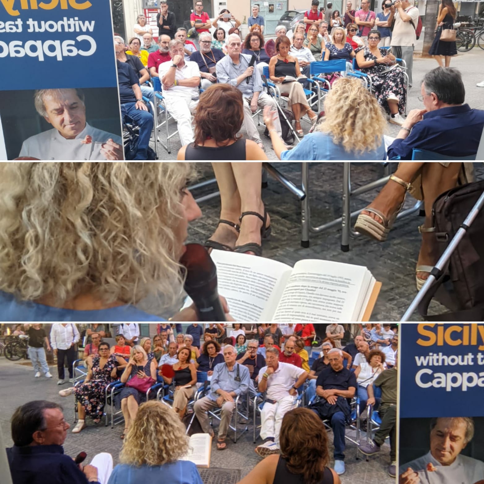 E, se dobbiamo parlare di coinvolgimento del pubblico, non possiamo non riservare un posto d’onore a Salvo Piparo, presente più volte in piazzetta in occasione della presentazione del suo libro “400A, il Festino di Santa Rosalia”, chiamando a raccolta neanche a dirlo centinaia di persone, come anche per accompagnare Lietta Valvo Grimaldi con la presentazione del suo libro “Palermo Marina”. Due occasioni, durante le quali Piparo non si è risparmiato, regalando ai fortunati presenti dei momenti di grande teatro, accompagnati dalla grande passione che anima il suo modo di essere artista, da considerare sicuramente preziosi se consideriamo il luogo e il contesto nel quale si sono tenuti.