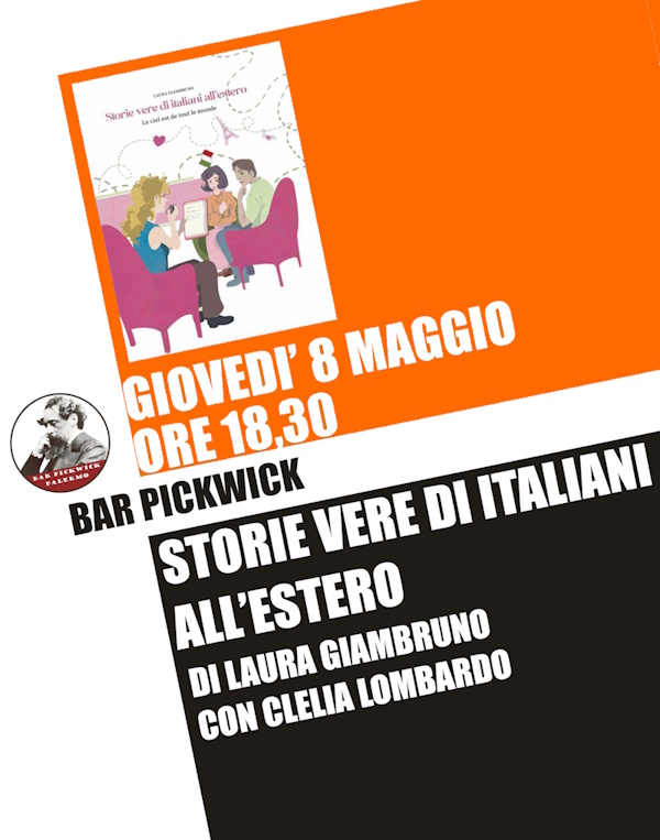 Giovedì 8 maggio a partire dalle 18,30 presso il Bar Pickwick di via Alessandro Paternostro 49 a Palermo, si terrà la presentazione del libro “Storie vere di italiani all’estero” di Laura Giambruno. A discutere con l’autrice ci sarà la scrittrice Clelia Lombardo.