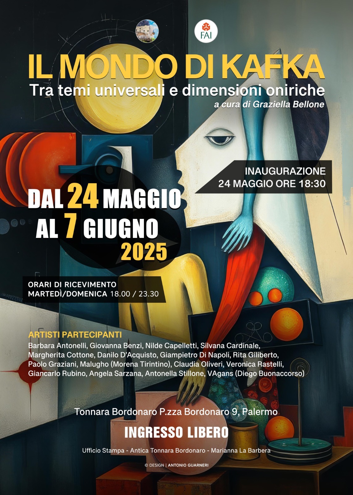 A centouno anni dalla scomparsa, l’Antica Tonnara Bordonaro di Palermo omaggia lo scrittore boemo con una collettiva curata dalla professoressa Graziella Bellone, dal titolo “Il mondo di Kafka tra temi universali e dimensioni oniriche”, in programma dal 24 maggio al 7 giugno nella magnifica struttura che sorge nella borgata marinara di Vergine Maria.