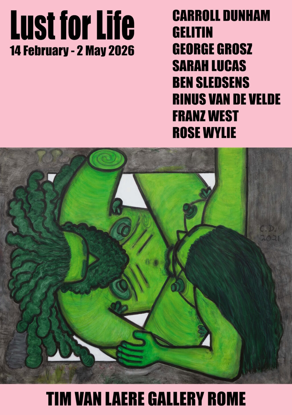 Tim Van Laere Gallery Rome è lieta di presentare Lust for Life, una mostra collettiva con opere di Carroll Dunham, Gelitin, George Grosz, Sarah Lucas, Ben Sledsens, Rinus Van de Velde, Franz West e Rose Wylie. Prendendo in prestito il titolo dall’iconico brano di Iggy Pop, Lust for Life si propone come una risposta alla tensione e all’incertezza del presente. Invece di chiudersi in sé, la mostra pone l’accento su energia, desiderio, ironia, spirito di sfida e sull’irriducibile impulso a creare. Attraverso generazioni e sensibilità differenti, questi artisti condividono un interesse per l’esperienza intensa e quasi esplosiva dell’essere vivi, e concepiscono l’arte come uno spazio in cui tale vitalità può essere esplorata, celebrata e percepita.