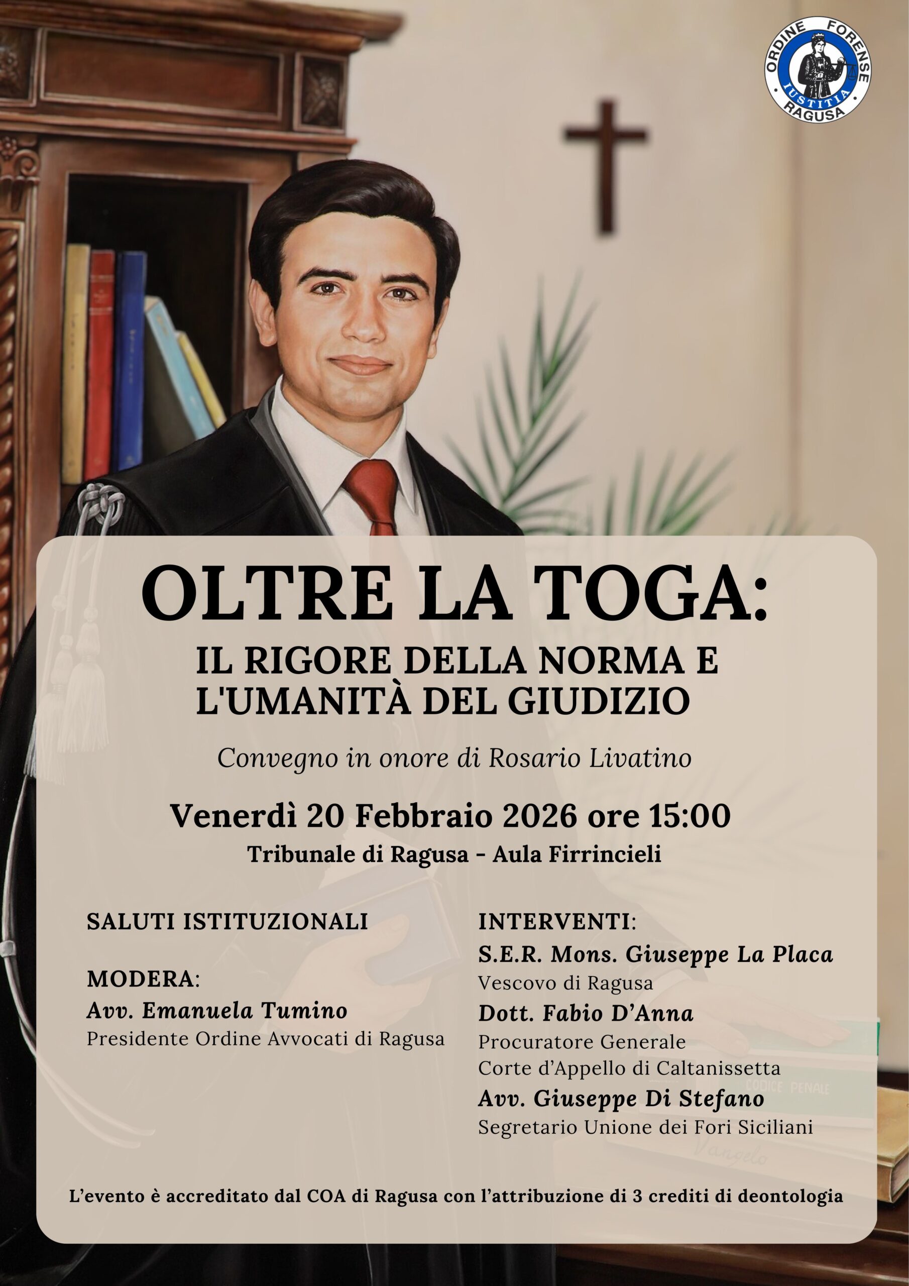 La rassegna si concluderà venerdì 20 febbraio alle ore 15.00 presso l’Aula Firrincieli del Tribunale di Ragusa con il convegno “Oltre la toga: il rigore della norma e l’umanità del giudizio”. L’incontro, moderato dall’avv. Emanuela Tumino, vedrà gli interventi di S.E. mons. Giuseppe La Placa, del dott. Fabio D’Anna e dell’avv. Giuseppe Di Stefano. L’evento è accreditato dal COA di Ragusa con il riconoscimento di tre crediti formativi in materia deontologica.