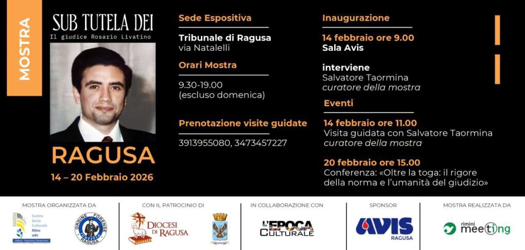 Dal 14 al 20 febbraio 2026 il Tribunale di Ragusa ospita la mostra “Sub tutela Dei. Il giudice Rosario Livatino”, percorso espositivo dedicato al magistrato siciliano ucciso dalla mafia nel 1990 e beatificato il 9 maggio 2021, patrocinata dal Comune di Ragusa e dalla Diocesi di Ragusa.